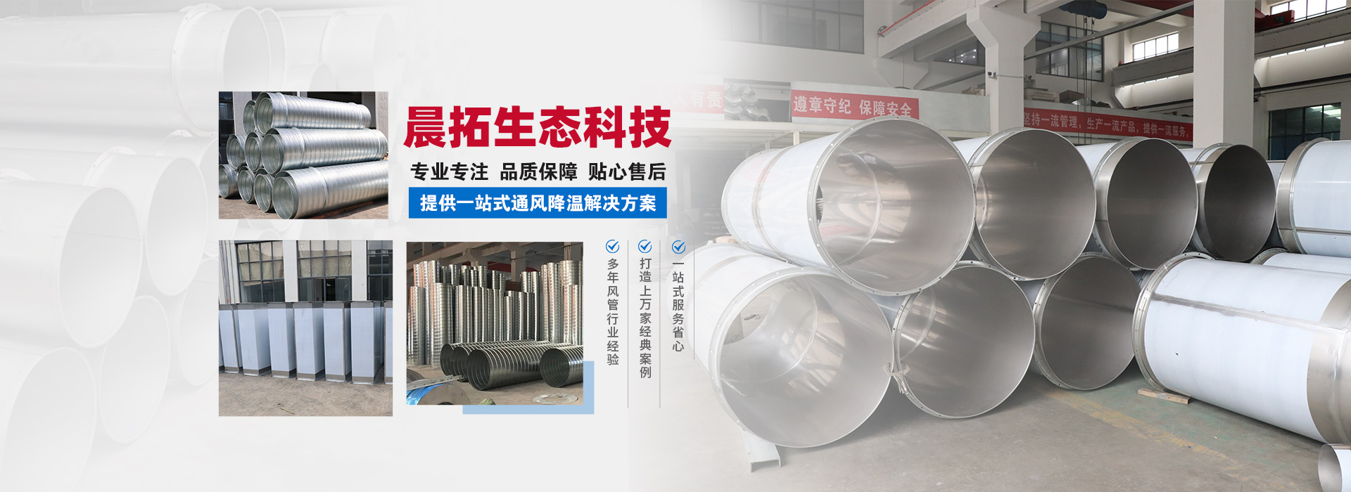 晨拓生態科技(常州)有限公司,是一家生產通風管道及設備、環保工程設計、工程安裝及調試的環保技術企業。公司辦公大樓擁有四層1200平方,公司廠區擁有5000平方生產車間,擁用行業眾多先進生產設備。公司主要生產螺旋風管、焊接風管、共板法蘭風管、角鋼法蘭風管、煙囪及塔架、雙層保溫風管、吸氣罩、消音器、靜壓箱、彎頭、三通、大小頭、風量調節閥等產品,我們同時承接機電暖通安裝工程。公司宗旨:"質量保